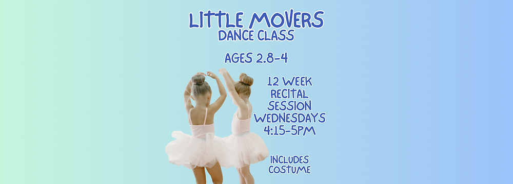 Class: Little Movers Recital Semester Instructor: DCU staff Wednesdays/March 18th - June 10th/4:15pm-5:00pm/Ages 2.8 - 4 years/$410 (NO CLASS 4/22) CLASSES ARE HELD AT 313 LITTLETON ROAD CHELMSFORD MA Ages 2.8-4 Our 12 week Spring Recital Semester runs March through June. This class is a combination of Tap and Ballet and is perfect for the child that wants to take part in a dance recital but did not commit to the full dance season! Costume included! Wednesday Semester Dates: 3/18, 25; 4/1, 8, 15, 29; 5/6, 13, 20, 27; 6/3, 10